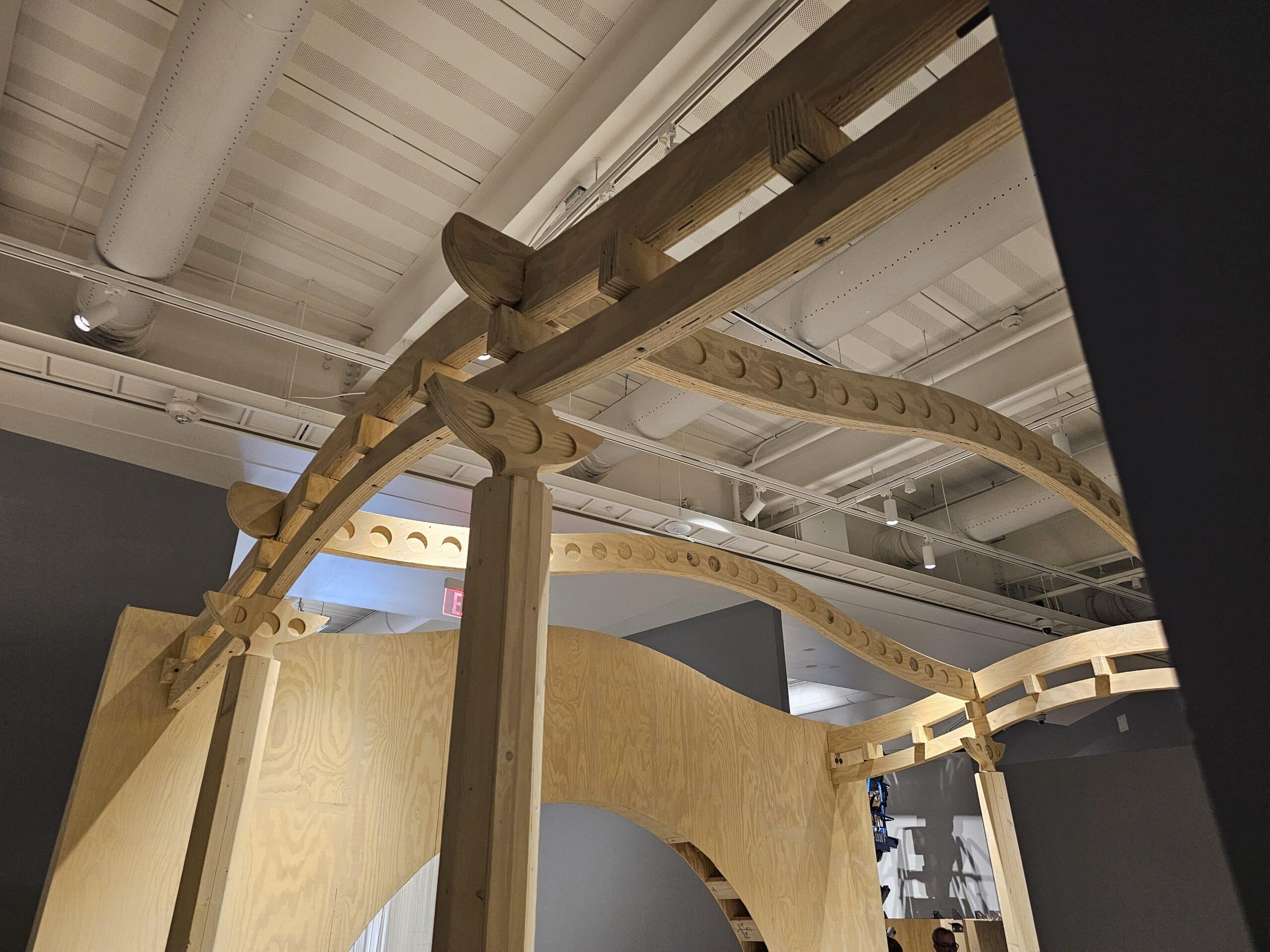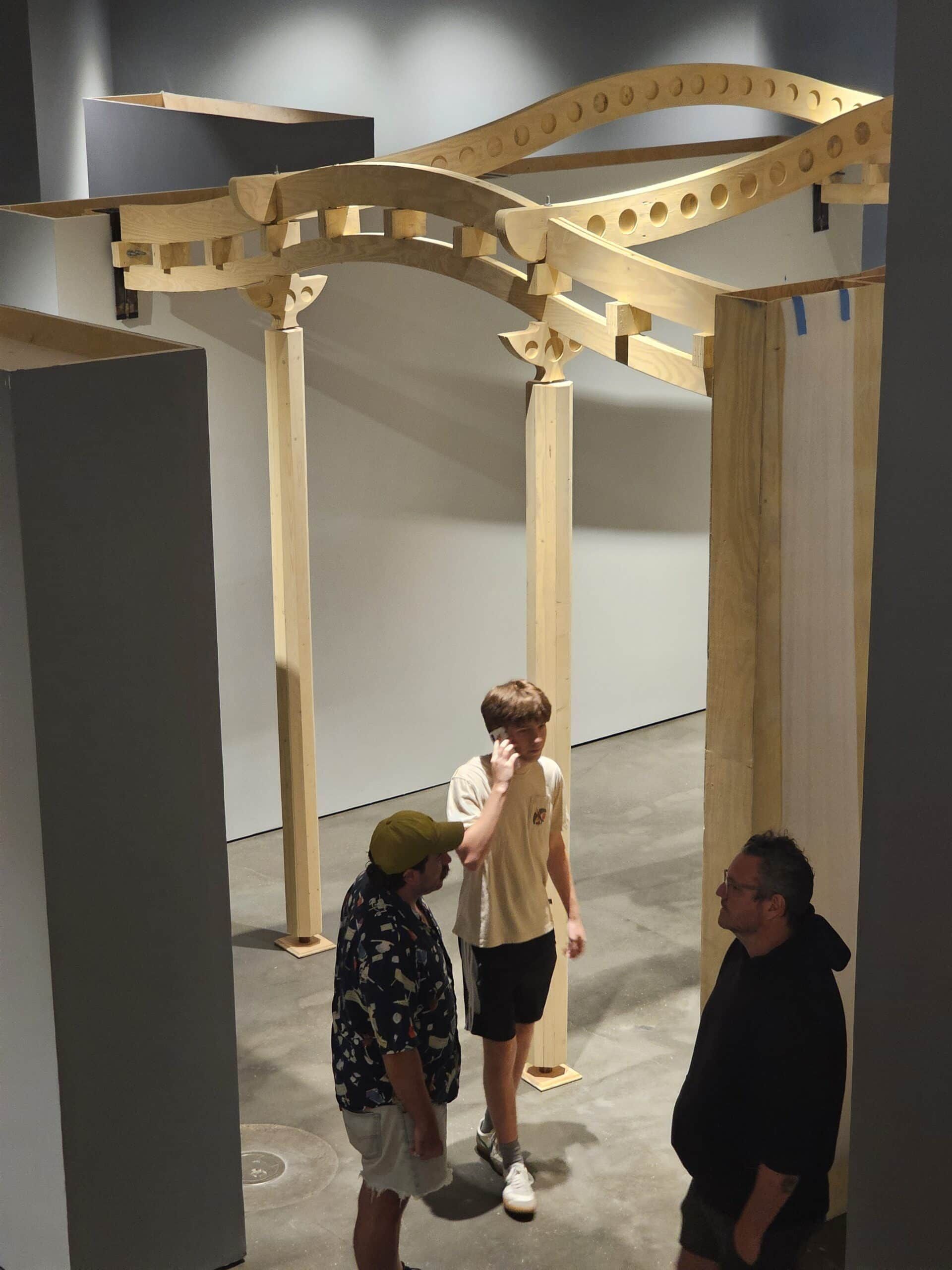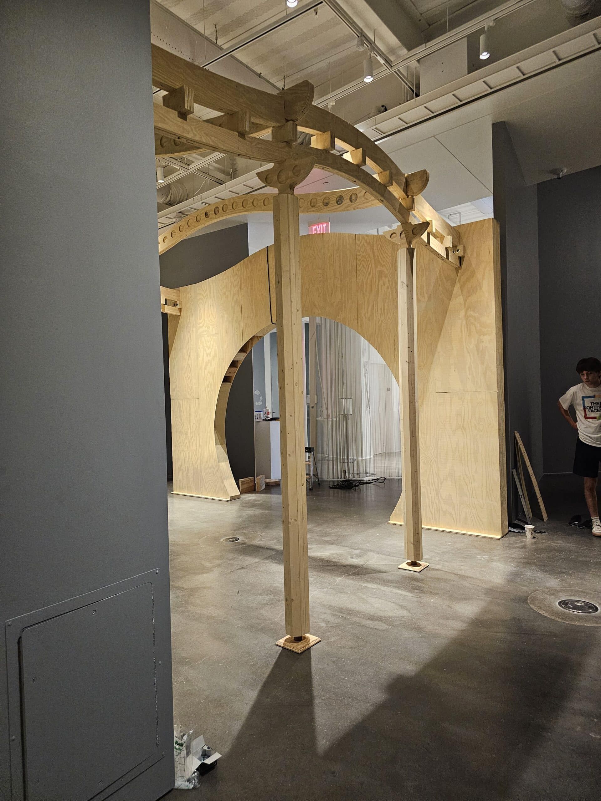 Threshold Structure – Serving as the primary entry sequence, this full-scale fabricated portal distilled the tectonic language of stone and heavy timber into a digitally rationalized plywood assembly. Its sweeping, arched geometry framed the first encounter with the exhibition while subtly choreographing movement, sightlines, and thematic tone.