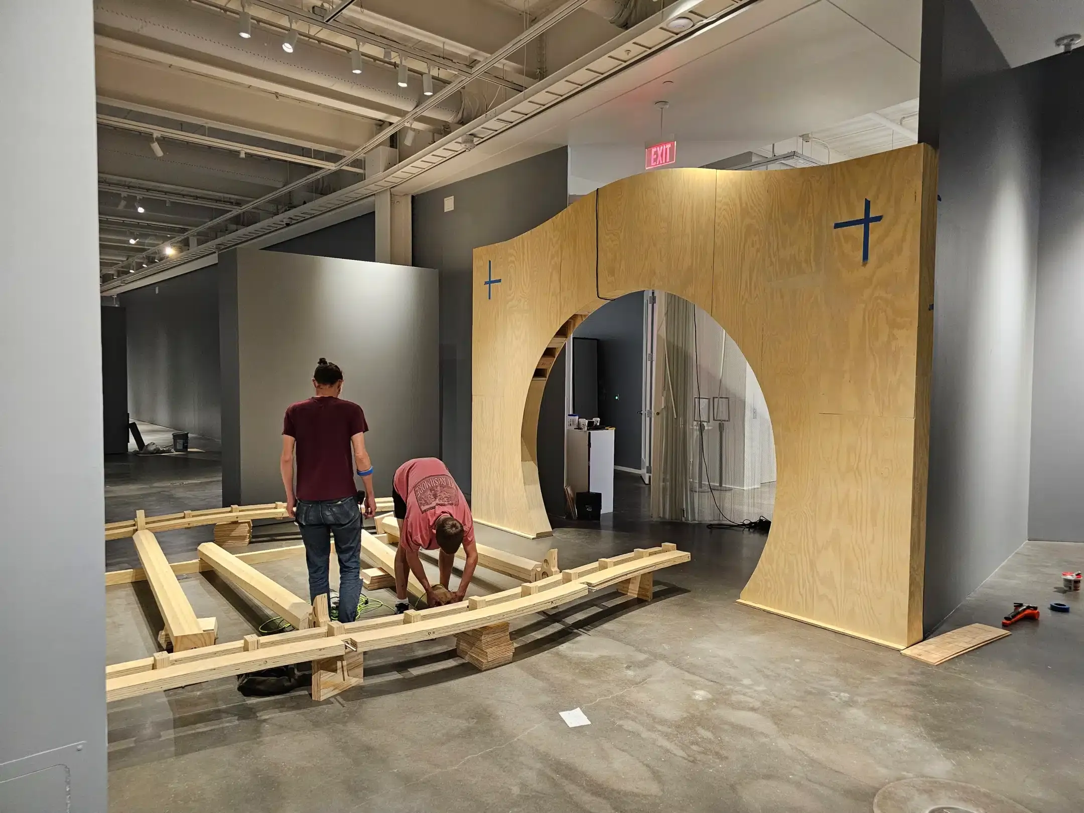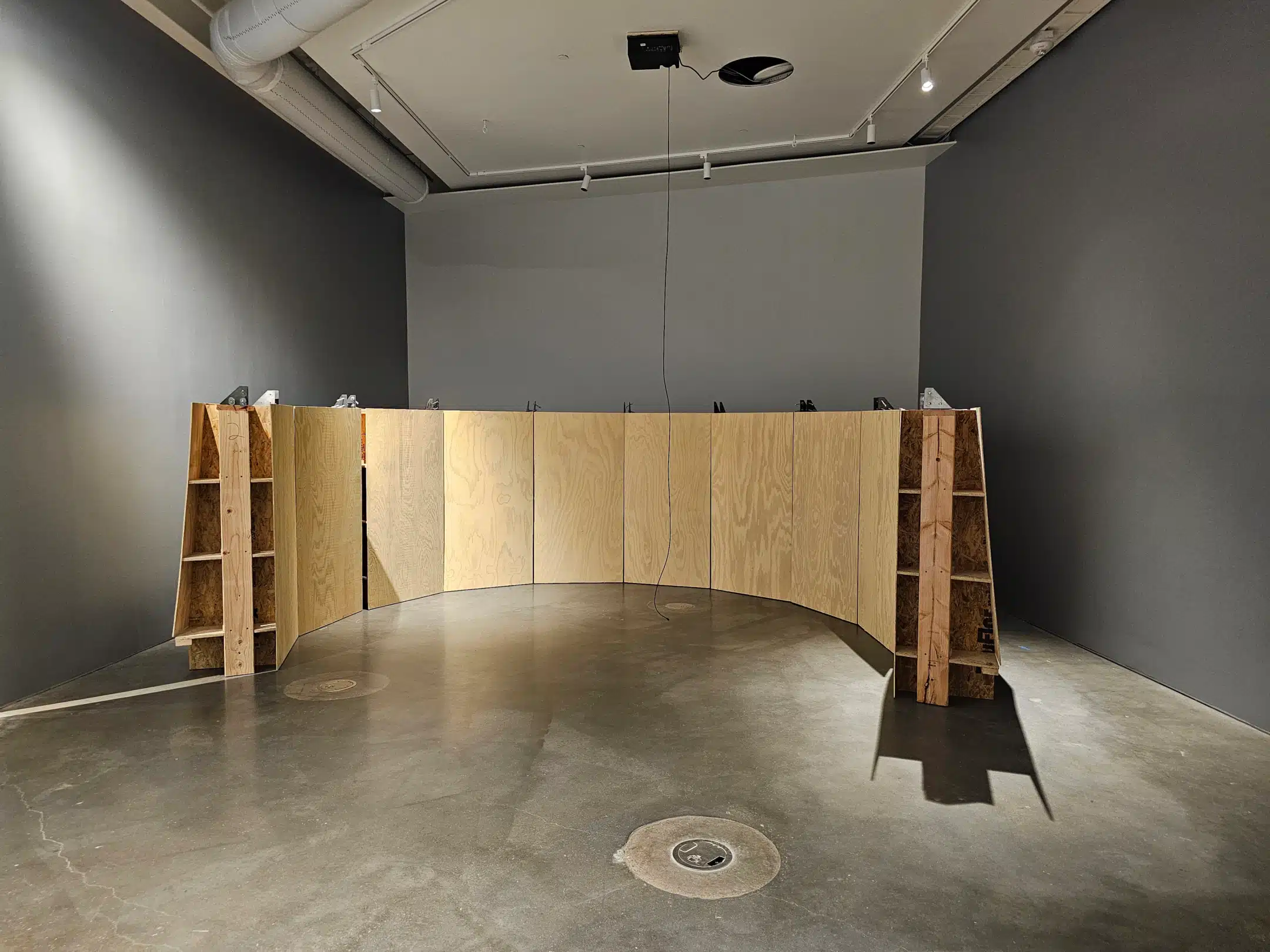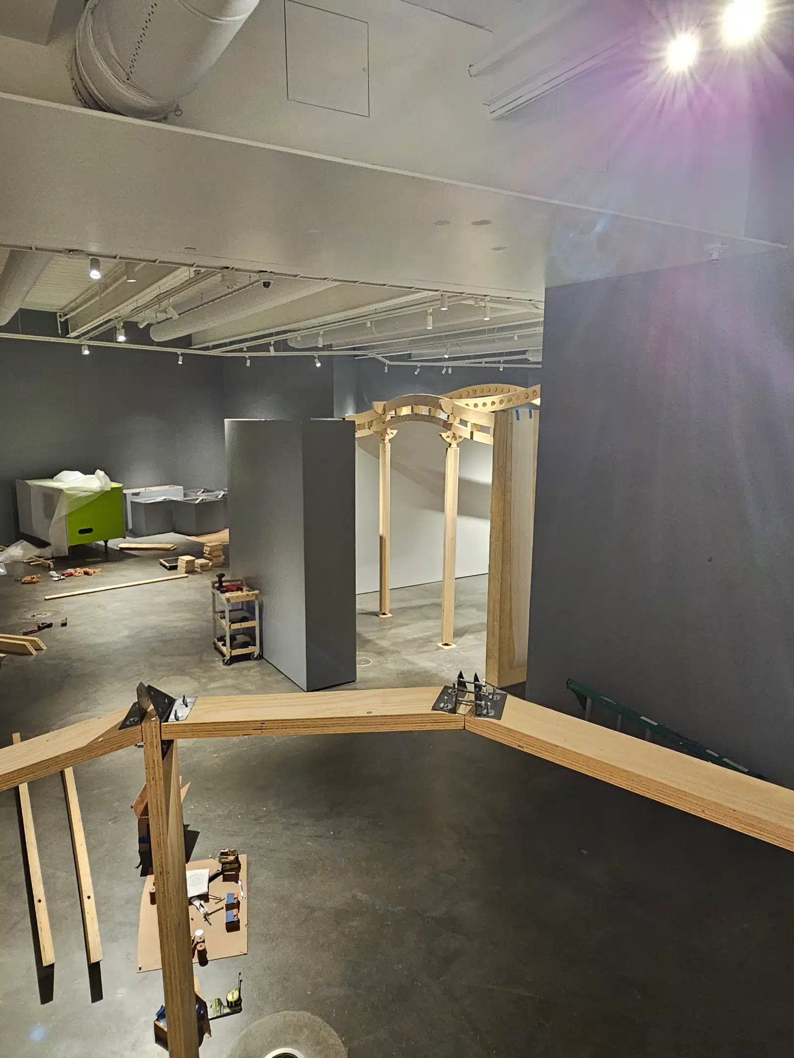 Threshold Structure – Serving as the primary entry sequence, this full-scale fabricated portal distilled the tectonic language of stone and heavy timber into a digitally rationalized plywood assembly. Its sweeping, arched geometry framed the first encounter with the exhibition while subtly choreographing movement, sightlines, and thematic tone.