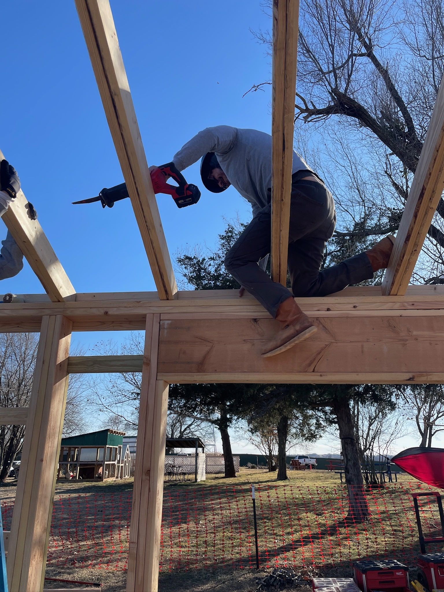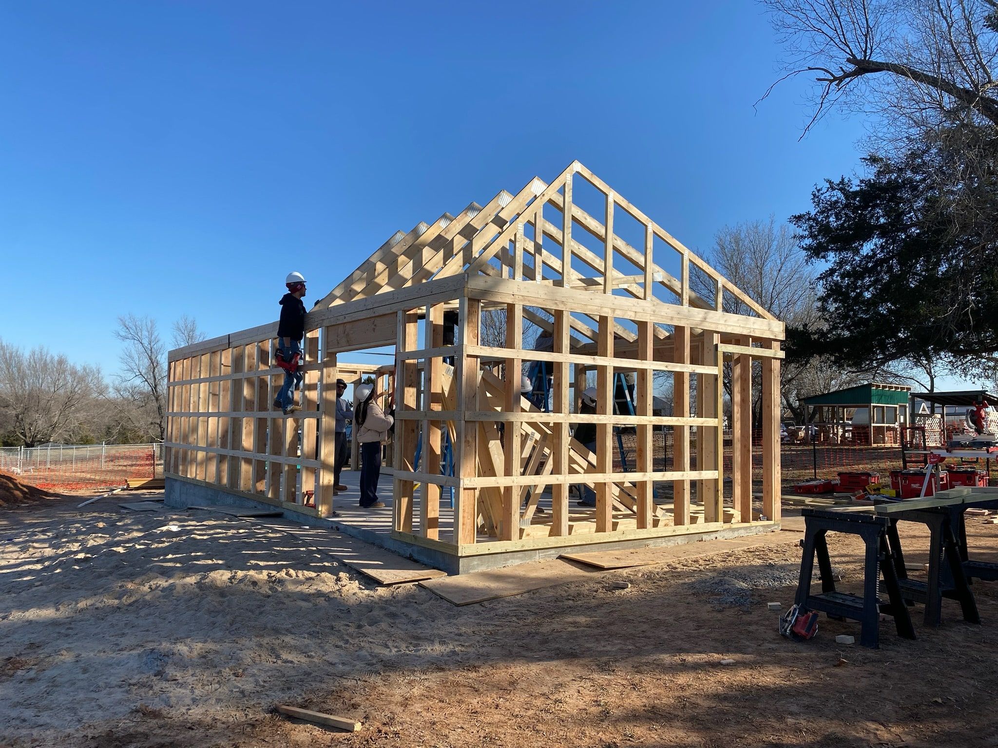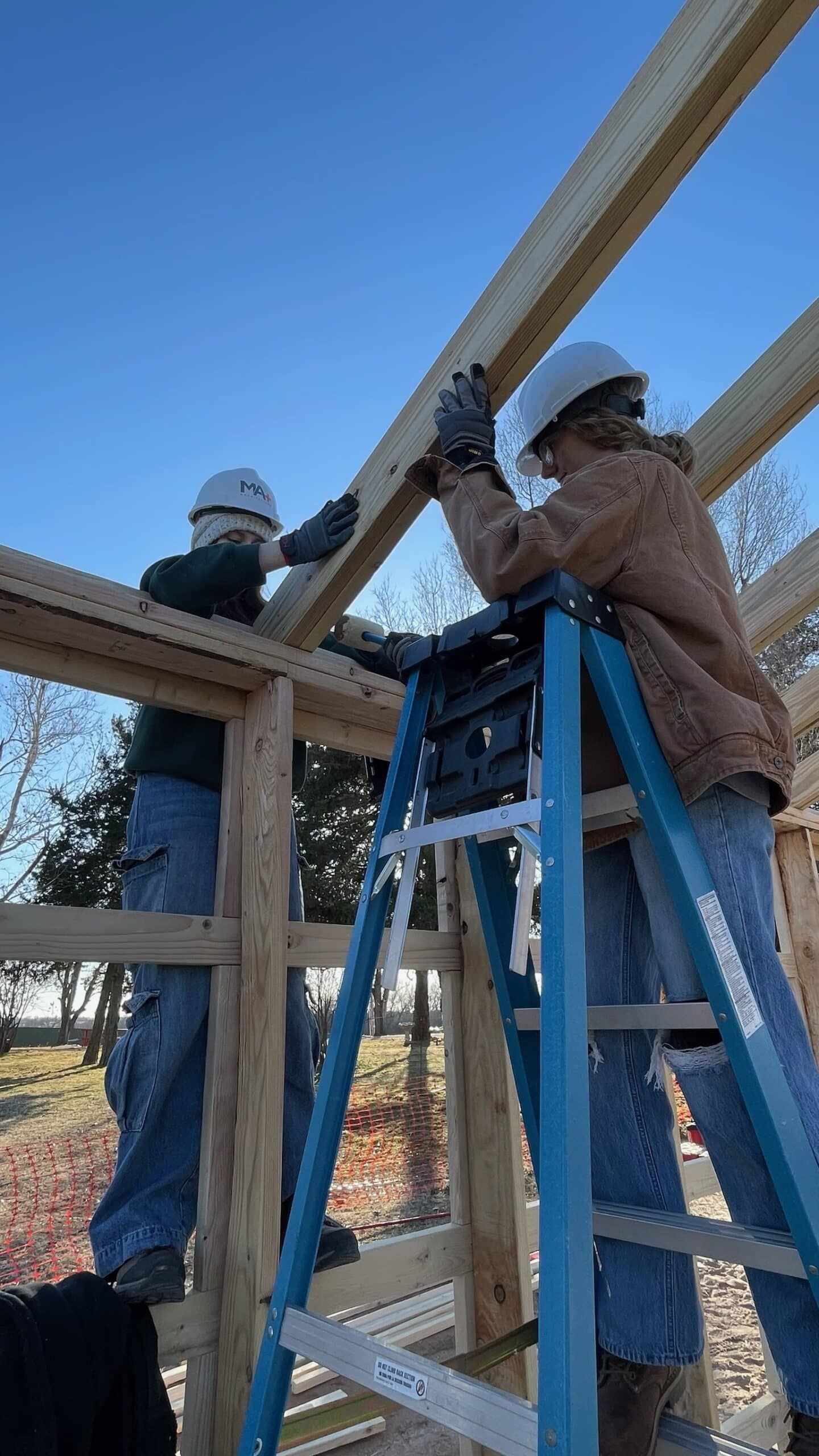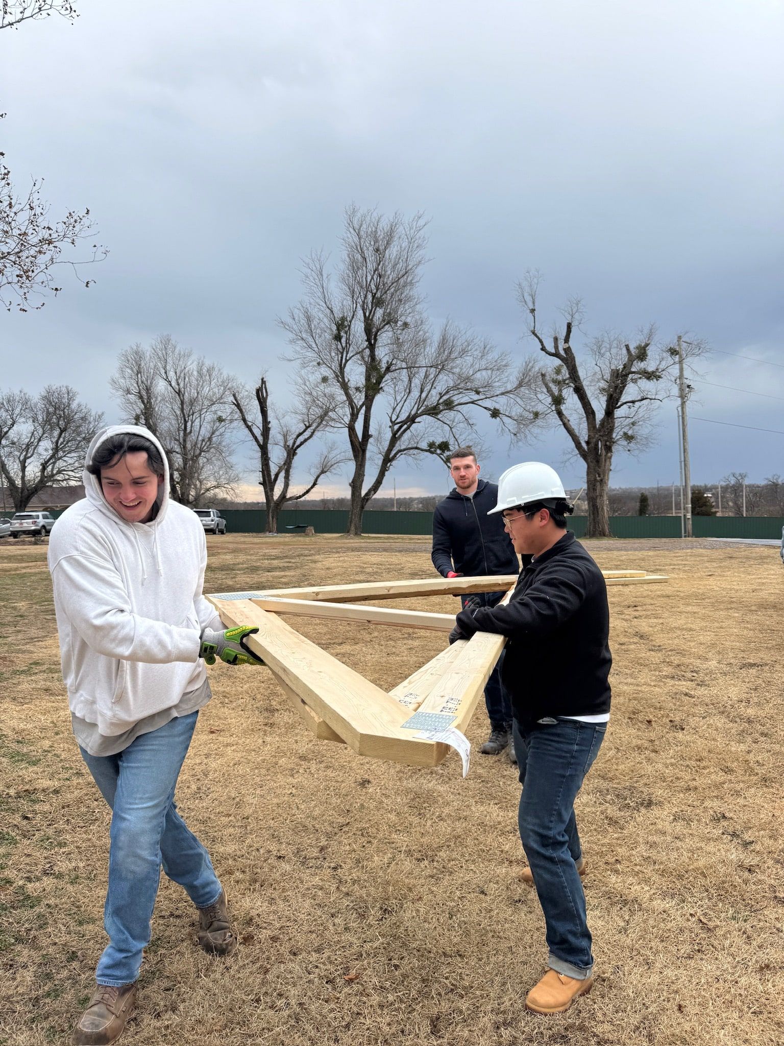 Design+Build students worked together to deliver and install each truss individually, carefully transporting them on-site with teamwork and care. Moving one truss at a time, they coordinated efforts to ensure safe handling and away from additional weather damage.