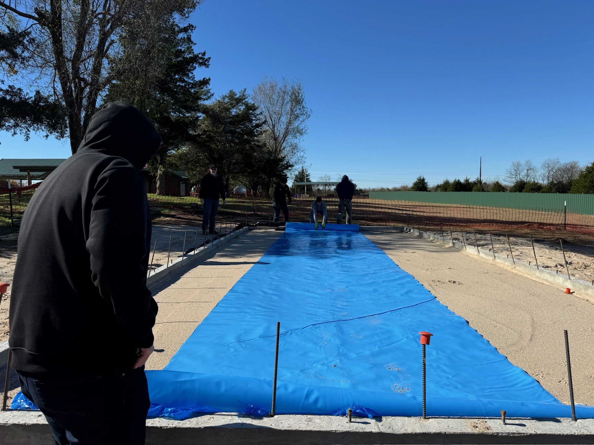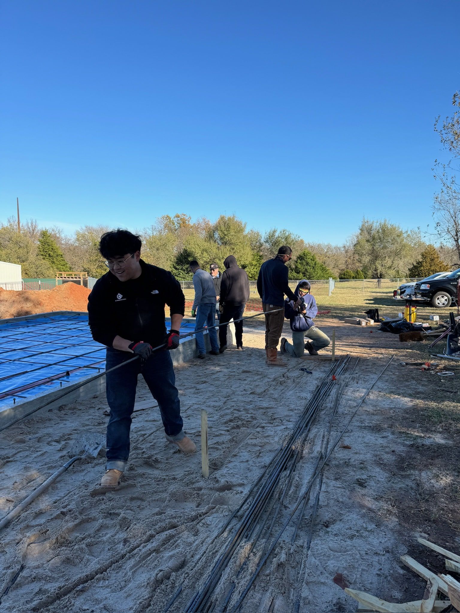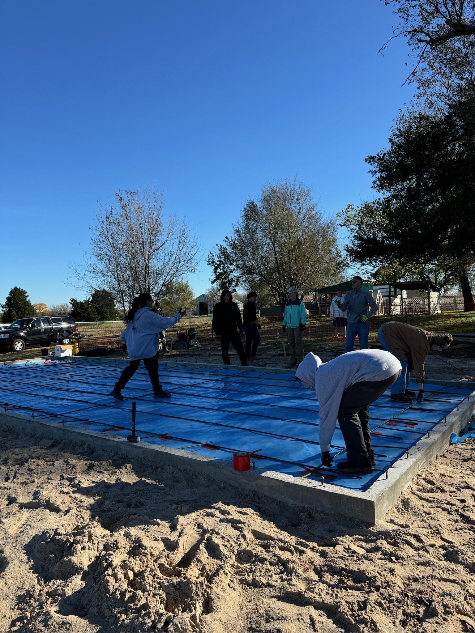 In finalizing the foundation, rebar is placed and tied together to reinforce the structure, providing support against tension and preventing cracking. Sand is then poured to create a smooth, stable base for the concrete, ensuring proper weight distribution, drainage, and preventing moisture-related issues.