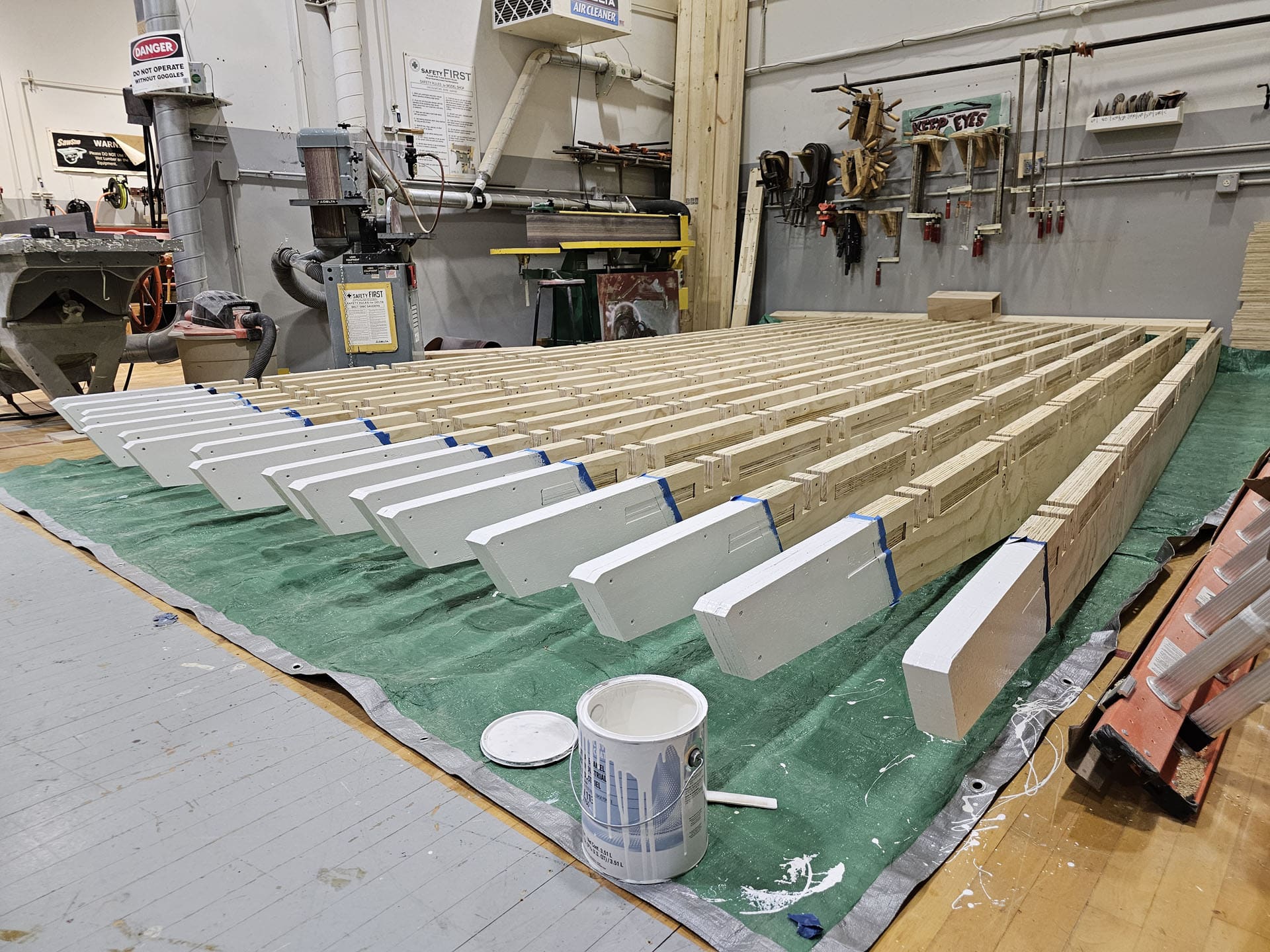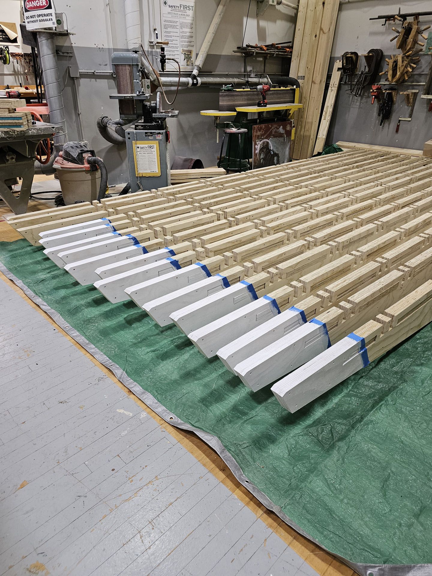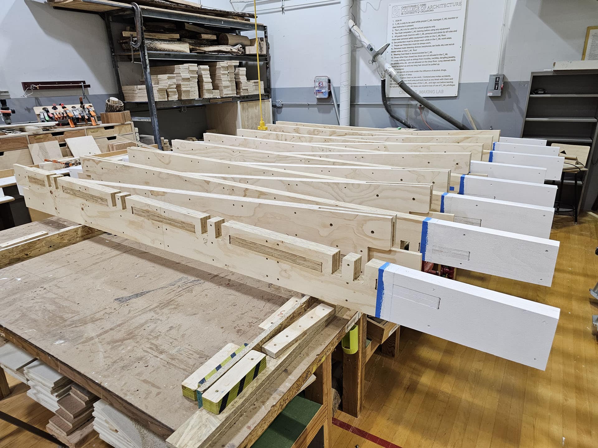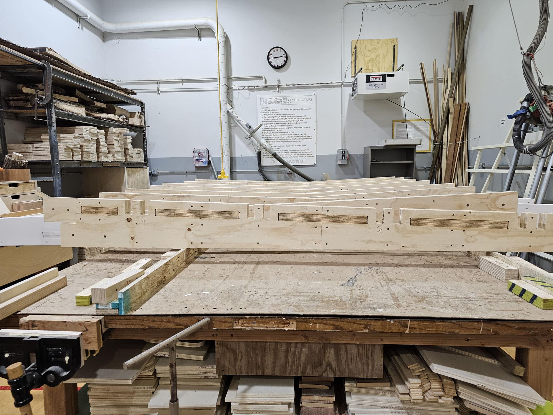 The students are currently in the final stages of crafting all plywood structural components and steel connections for the Urban Farming Lab. Through careful inspection, each plywood piece is carfully checked to ensure it’s precisely fabricated and meets engineering and assembly standards. By carefully verifying and assembling each component, they guarantee that every joint seamlessly integrates, ensuring the lab’s structural integrity and durability.